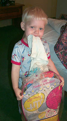 Matthew awoke Easter morning in our hotel room in Amarillo to find a loaded basket waiting for him.