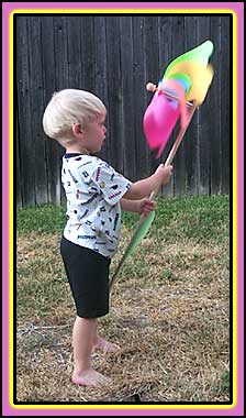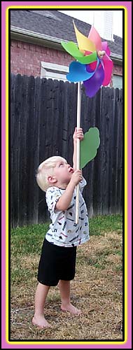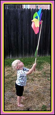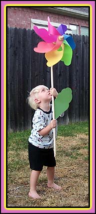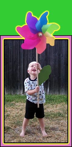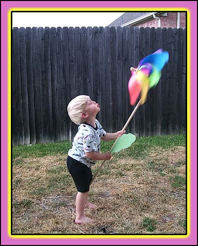 Matthew harnesses the power of the wind with a giant flower pinwheel in our backyard.