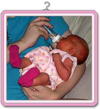 Having a bottle right after we got home from the hospital. Kaylee gets her whole body into it, including lifting her feet. 5-1-02