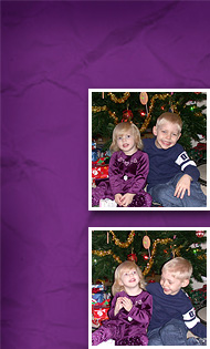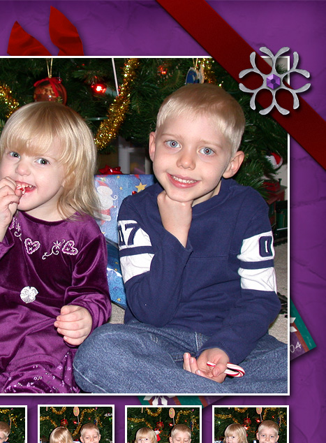 From RAKscraps December 2004 kit: purple crumpled paper and tag (altered) by Jeanine Baechtold, snowflake brad by AmyJo Smith. Ribbon knot from E-scapeandscrap's Christmas Cheer kit by Julie Mead. Red satin ribbons from 3Scrapateers All Wrapped up kit by Lianne Carper.