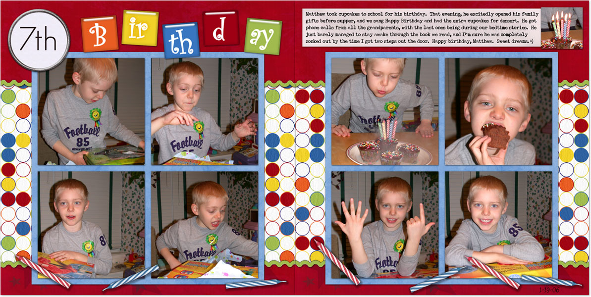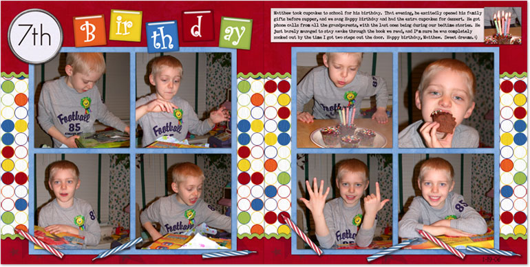 Credits: BirthdayZ Mega Kit available at DigiscrapZ: red and dot papers and "7th" alpha by Jen Reed; blue paper, title tiles, candles and ricrac by Krista Mettler.
