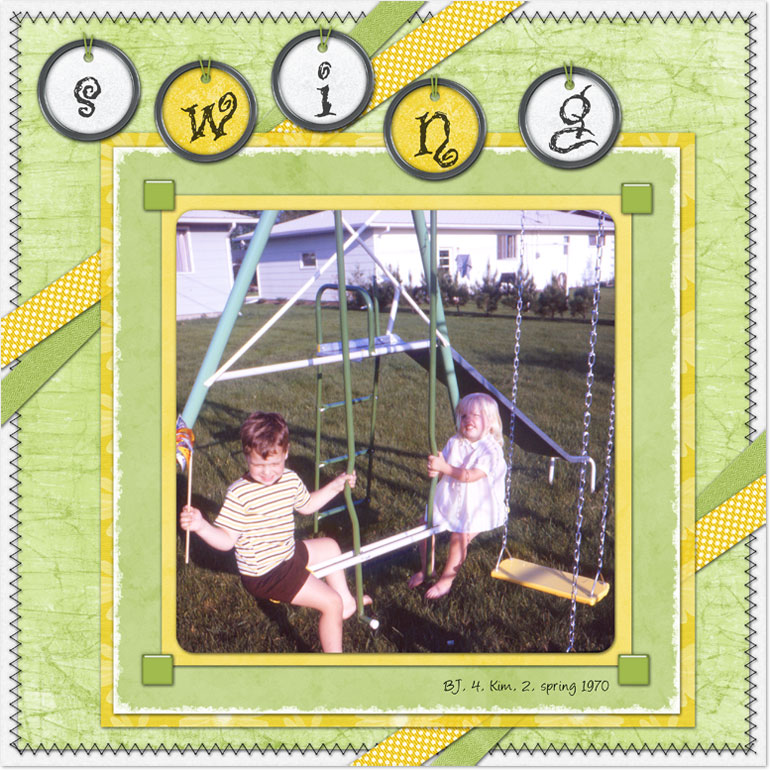 Credits: BirthdayZ Mega Kit available at DigiscrapZ: papers, brads, and tags by Krista Mettler; ribbons by Jen Reed. Zig-zag stitching by Shabby Princess.